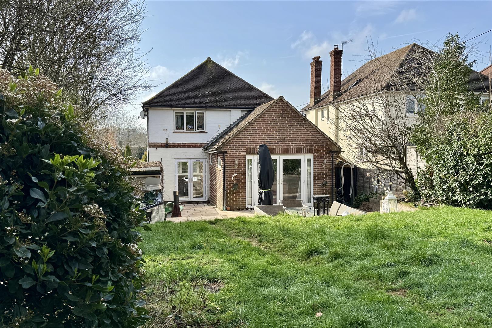 An attractive extended three bedroom detached family house, providing well planned accommodation, as well as offering great potential for further extension, subject to planning permission. The house currently comprises an entrance hall & cloakroom, delightful dual aspect sitting room, study, large kitchen/dining room and useful utility room. On the first floor there are three bedrooms and a bathroom. Outside there is a driveway providing ample off road parking and an attractive 100ft rear garden. The property is located at the end of small cul de sac only minutes from the village centre with its excellent local shops, facilities, popular schools, nearby bus routes, main line station and close to much common and heathland.